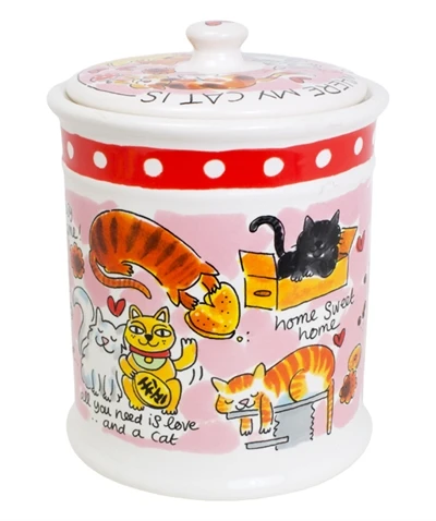 De Blond Amsterdam Voorraadpot Kat 16X16X22,5 cm is een aardewerken pot in Blond-stijl om de brokjes of snoepjes van jouw dier in op te bergen. Deze leuke voorraadpot vrolijkt gelijk de hele ruimte op! De aardewerken pot is uitgevoerd in de bekende Blond Amsterdam-stijl, met een vrolijke opdruk van diverse katten en leuke tekstjes. De voorraadpot is wit met een roze achtergrond en rode band. Ook op het deksel is een leuke opdruk geplaatst. De voorraadpot is magnetron en vaatwasser bestendig en mag niet ontbreken in elk dierenhuishouden!