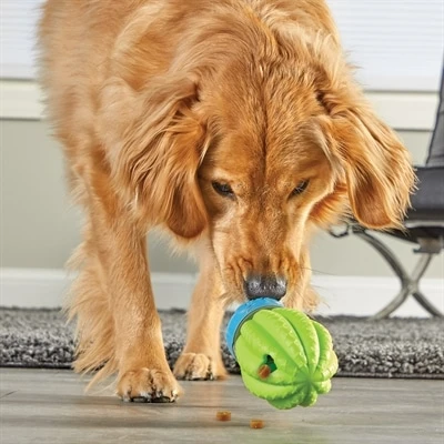 De Brightkins Cactus Surprise Treat Dispenser 12,5X12,5X24,1 cm is een speeltje voor de hond waarbij behendigheid en intelligentie getraind worden. Deze cactus heeft een instabiele ondergrond, waardoor het alle kanten op gaat. Als de hond de cactus in de juiste houding weet te manoeuvreren, komen er snoepjes of brokjes uit het kleine gaatje aan de bovenkant. Hierdoor is het ook te gebruiken als slowfeeder. Een leuk spelletje waarbij behendigheid en intelligentie nodig zijn om een beloning te krijgen.