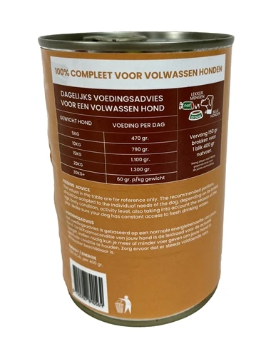 Samenstelling: 65% vlees en geselecteerde slachterijproducten (minimaal 30% kip), rijstmeel, lijnzaadolie, 0,2% bouillon, minerale stoffen
