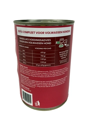 Samenstelling: 65% vlees en geselecteerde slachterijproducten (minimaal 4% wild), rijstmeel, lijnzaadolie, 0,2% bouillon, minerale stoffen