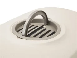 – Aflopend deksel met kleine gaatjes zorgt dat grit bij het verlaten terug in de bak valt