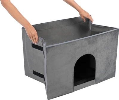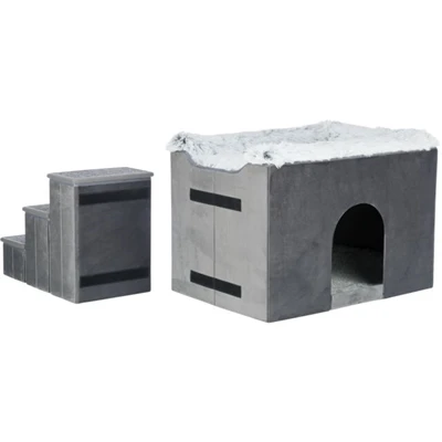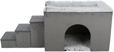 De Trixie Hondenmand Huis Harvey Met Trap Grijs / Wit 119 x 50 x 47 cm is een multifunctionele hondenhok/schuilhuis en ligmand in 1. Het huisje heeft een zacht, wendbaar kussen met schuimrubber vulling, welke geschikt is om op 40 graden te wassen in de wasmachine.Op het huisje ligt een bekleed ligplateau met afneembare pluche relaxmand van 70 x 50 cm en is bereikbaar met de plaatsbare traptreden. Deze schuilplaats is geschikt voor honden en katten en kan een belasting tot 15 kilo dragen.