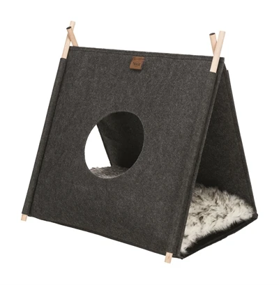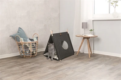 De Trixie Kattenmand Tent Elfie Met Kussen Vilt Antraciet 50 x 46 x 52 cm is een schuilplaats voor de kat, een tipi tent gemaakt van vilt met omkeerbaar kussen. Echt lekker wegdromen doet jouw kat of kleine hond in deze leuke schuiltent van Trixie. Deze tent is gemaakt van vilt met een frame van hout, dat inklapbaar en ruimtebesparend op te bergen is. De tent is voorzien van een omkeerbaar kussen met een overtrek met aan één zijde langharig pluche om lekker in weg te kruipen en aan de andere kant geweven stof, gevuld met comfortabel polyesterfleece. De slipvaste onderkant zorgt er bovendien voor dat de tent niet kan verschuiven bij het in- en uitstappen.