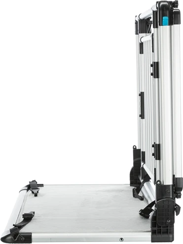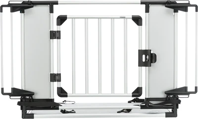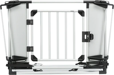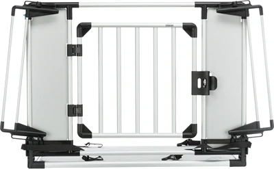 Het Trixie Kofferbak Hek Aluminium / Kunststof Grijs / Zwart 94 – 114 x 69 cm is een universeel hek met bodemplaat om de kofferbak van de auto een hondenbox te maken. Jouw hond gaat zo eenvoudig mee op pad tijdens autoritten! Dit hek bestaat uit een hek voor plaatsing achter de achterklep met bodem met klittenbandpootjes, voorzien van een slipvaste ligmat. Het hek is voor bijna elk type auto geschikt door de traploos aan te passen breedte (verstelbare zijdelen) en de verstelbare hoek van het hek. Zo stelt dit hek je in staat de gehele bagageruimte te gebruiken als ligoppervlak in bijna elke auto. Indien je toch gebruik van de normale bagageruimte wilt maken, kun je het hek eenvoudig inklappen. Het hek is voorzien van vier bevestigingshaken en gemaakt van kunststof en aluminium.