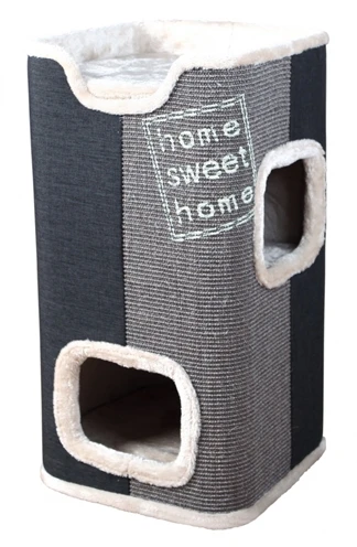 De Trixie Krabton Jorge Antraciet/Grijs/Lichtgrijs 38X38X78 cm is een krabpaal van gewoven stof en pluche met sisal krabvlakken. In de paal zijn twee verdiepingen, elk met een wendbaar kussen. De hoezen van de kussens zijn te wassen in de wasmachine op 30 graden Celsius, de binnenvoering is geschikt voor handwas. De schuilplaatsen zijn geheel voorzien van pluche en de paal is voorzien van een sisal-krabvlak.Â