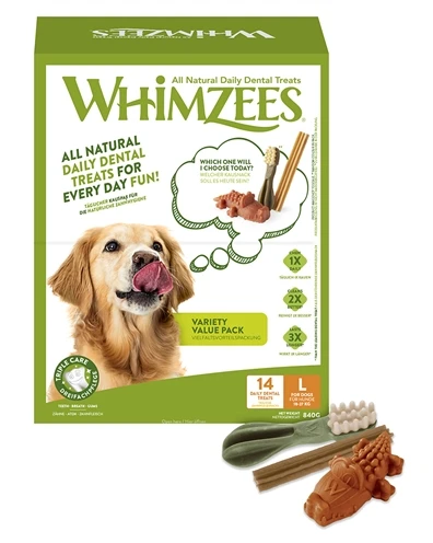 De juiste verzorging van het hondengebit is erg belangrijk. Honden verzorgen hun tanden en kiezen door te kauwen; omdat het materiaal langs de tanden wrijft, worden bacteriën en zo tandplak verminderd. Ondersteun jouw hond hierin met deze leuke Whimzees Variety Box! Deze box bestaat uit drie verschillende varianten Whimzees, namelijk de kauwstick, de tandenborstel en de krokodil. De snack is gemaakt van 100% natuurlijke ingrediënten op basis van heerlijke zoete aardappel en naast nuttig dus ook nog eens lekker en gezond. Daarnaast de de Whimzees glutenvrij, licht verteerbaar en vegetarisch en daardoor dus voor veel honden geschikt.